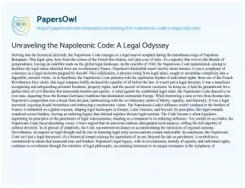 Unraveling the Napoleonic Code: A Legal Odyssey” takes readers on a journey through the historical intricacies of Napoleon Bonaparte’s legal masterpiece. This essay explores the Code’s origins during the French Revolution, emphasizing its role in simplifying and unifying legal frameworks. Delving into its core principles of equality and individual rights, the narrative portrays the Napoleonic Code as a trailblazer that left an indelible mark on global legal systems. The essay acknowledges criticisms while highlighting the Code’s enduring influence and its unique resonance in the symphony of jurisprudence. At PapersOwl, you’ll also come across free essay samples that pertain to Odyssey.