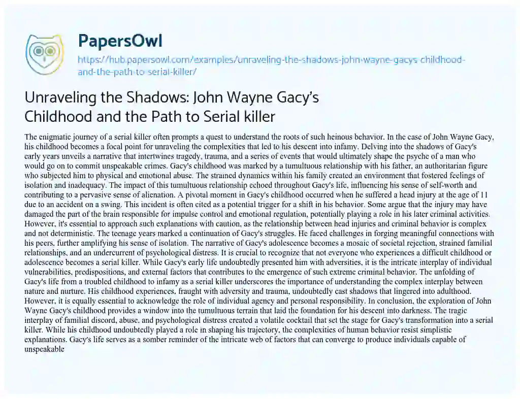 Unraveling the Shadows: John Wayne Gacy's Childhood and the Path to Serial killer. (2023, Nov 24). Retrieved from https://hub.papersowl.com/examples/unraveling-the-shadows-john-wayne-gacys-childhood-and-the-path-to-serial-killer/