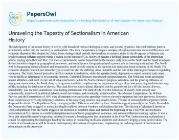 Delve into the intricate tapestry of American history with an exploration of “Unraveling the Tapestry of Sectionalism in U.S. History.” This essay navigates the complexities of regional interests, cultural nuances, and economic disparities that defined the nation during pivotal periods. From the roots of sectionalism in geography and economic ideologies to the cultural clash and the explosive issue of slavery, the narrative weaves through historical landscapes. Discover how these threads of sectionalism ultimately led to the Civil War, leaving an indelible mark on the American identity. This essay serves as a captivating journey, shedding light on the forces that shaped a nation at the crossroads of its history. PapersOwl showcases more free essays that are examples of American History.