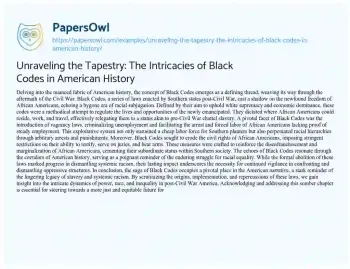 Unraveling the Tapestry: The Intricacies of Black Codes in American History. (2024, Feb 27). Retrieved from https://hub.papersowl.com/examples/unraveling-the-tapestry-the-intricacies-of-black-codes-in-american-history/