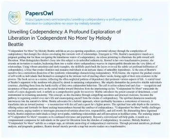 Unveiling Codependency: A Profound Exploration of Liberation in 'Codependent No More' by Melody Beattie. (2024, Jan 26). Retrieved from https://hub.papersowl.com/examples/unveiling-codependency-a-profound-exploration-of-liberation-in-codependent-no-more-by-melody-beattie/