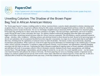 Unveiling Colorism: The Shadow of the Brown Paper Bag Test in African American History. (2023, Dec 22). Retrieved from https://hub.papersowl.com/examples/unveiling-colorism-the-shadow-of-the-brown-paper-bag-test-in-african-american-history/