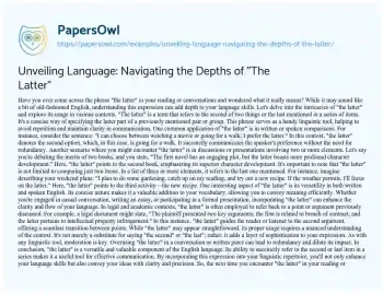 Delve into the nuances of the phrase “the latter” and discover its multifaceted applications in language. This insightful exploration unravels its role as a concise tool for specifying the second or last item in a series, enhancing communication clarity. From comparisons in casual conversations to academic and legal contexts, “the latter” proves its versatility. The essay emphasizes its valuable contribution to written and spoken English, urging moderation in usage for optimal impact. Readers are encouraged to embrace the sophistication this expression adds to language, acknowledging it as a vital component that elevates both casual and formal communication. Whether navigating weekend plans or legal documents, understanding and wielding “the latter” can significantly enhance one’s language skills and precision in conveying ideas. Moreover, at PapersOwl, there are additional free essay samples connected to Language.