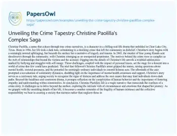 Explore the chilling depths of true crime in ‘Unveiling the Crime Tapestry: Christine Paolilla’s Complex Saga.’ This essay delves into the enigmatic life of Christine Paolilla, a central figure in a shocking 2003 quadruple murder in Clear Lake City, Texas. Unraveling the complexities of her troubled past, societal pressures, and the unforeseen descent into crime, the narrative sheds light on the multifaceted factors that led to this unthinkable act. Beyond the headlines, the essay prompts reflection on mental health awareness and community support, serving as a cautionary tale about the fragile nature of human existence and the collective responsibility we share in shaping a compassionate society. PapersOwl offers a variety of free essay examples on the topic of Crime.