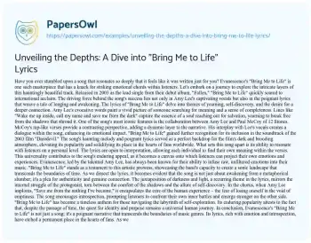 Unveiling the Depths: A Dive into "Bring Me to Life" Lyrics. (2024, Jan 26). Retrieved from https://hub.papersowl.com/examples/unveiling-the-depths-a-dive-into-bring-me-to-life-lyrics/