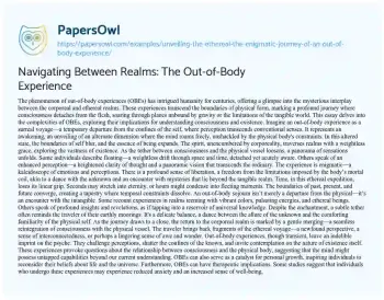 An essay on the concept of an “Out-of-Body Experience” delves into the intriguing phenomenon where consciousness temporarily separates from the physical body, traversing realms beyond the constraints of corporeal existence. This exploration delves into the surreal nature of such experiences, describing the sensation of detachment from the physical form and the heightened perceptions that accompany this departure. It delves into the subjective accounts of individuals who’ve encountered this phenomenon, narrating their encounters with the ethereal, the sense of liberation, and the mysteries encountered in this transcendent state. The essay contemplates the implications of such experiences on human understanding, consciousness, and the enigmatic nature of existence, shedding light on the spiritual, psychological, and philosophical aspects of these inexplicable journeys beyond the boundaries of the tangible world. PapersOwl showcases more free essays that are examples of Experience.