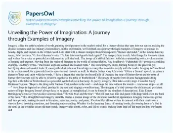 This essay is a captivating exploration of the art of imagery in literature and rhetoric. Through a collection of diverse examples, it unveils how imagery serves as a powerful tool to engage readers and listeners on a profound level. From the timeless beauty of Shakespeare’s longing Juliet to the thought-provoking symbolism of burning books in Ray Bradbury’s dystopian vision, the essay showcases how imagery transcends genres and time periods. It also delves into the realm of speeches, drawing inspiration from Martin Luther King Jr.’s dream of racial harmony. In poetry, it finds the delicate yet persistent nature of hope in Emily Dickinson’s verses and even highlights the impact of simple descriptions in Ernest Hemingway’s prose. Ultimately, this essay celebrates the ability of imagery to breathe life into words, creating vibrant mental pictures that resonate deeply with audiences, making it a captivating journey through the world of vivid literary imagery. At PapersOwl, you’ll also come across free essay samples that pertain to Imagination.