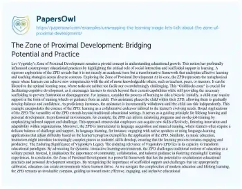 Embark on a captivating exploration of the Zone of Proximal Development (ZPD) in this enlightening essay. Delving into the concept coined by psychologist Lev Vygotsky, the narrative unveils the magic of learning within that sweet spot where challenges meet support. From classroom dynamics to real-world scenarios, the ZPD emerges as a transformative guide, emphasizing collaboration and tailored assistance in the journey of acquiring new skills. This essay invites readers to reconsider traditional education models, embracing a more dynamic, learner-centric paradigm. Whether navigating the early stages of a new language or tackling a career shift, the ZPD becomes a compass for lifelong learning, reminding us of the collaborative dance between learners and their guides. Additionally, PapersOwl presents more free essays samples linked to Learning.