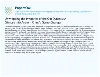 Unwrapping the Mysteries of the Qin Dynasty: A Glimpse into Ancient China's Game-Changer. (2024, Feb 01). Retrieved from https://hub.papersowl.com/examples/unwrapping-the-mysteries-of-the-qin-dynasty-a-glimpse-into-ancient-chinas-game-changer/