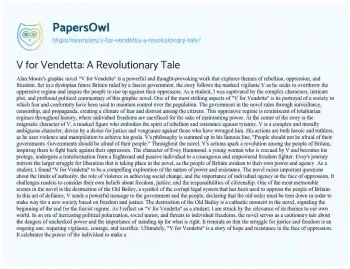 In conclusion, "V for Vendetta" is a timeless and powerful work that continues to resonate with readers today. Its themes of rebellion, oppression, and freedom are as relevant now as they were when the novel was first published. As a student, I have been deeply moved and challenged by the story of V and his fight against tyranny. It is a reminder that the struggle for justice and freedom is never easy, but it is always worth fighting for.