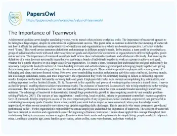 The Importance of Teamwork. (2020, Feb 15). Retrieved from https://hub.papersowl.com/examples/value-of-teamwork/