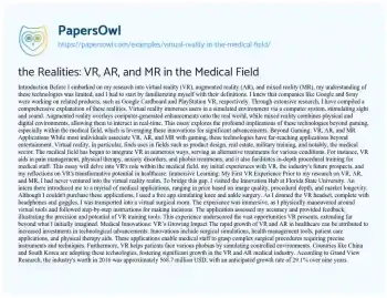 the Realities: VR, AR, and MR in the Medical Field. (2019, May 19). Retrieved from https://hub.papersowl.com/examples/virtual-reality-in-the-medical-field/