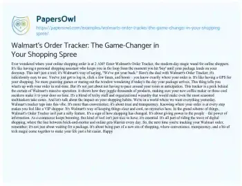 This essay explores the wonders of Walmart’s Order Tracker, a tool that’s revolutionized the online shopping experience. It’s portrayed as a personal shopping assistant, providing real-time updates on purchases, from the moment of ordering to the final delivery. The piece highlights the ease and user-friendliness of the system, likening it to a GPS for shopping orders. Beyond convenience, the essay delves into how the tracker exemplifies Walmart’s mastery in managing its vast supply chain and logistics. It emphasizes the tracker’s role in fostering customer trust and transparency, crucial in today’s fast-paced e-commerce world. The essay also reflects on the broader impact of such technologies, noting how Walmart’s Order Tracker is a signpost of the changing landscape of shopping, where digital tools are not just luxuries but necessities. Overall, the piece presents Walmart’s tracker as more than just a feature; it’s a key part of a new era in shopping, blending technology, convenience, and customer empowerment. PapersOwl offers a variety of free essay examples on the topic of Walmart.