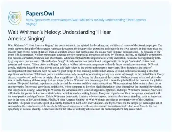 Walt Whitman's Melody: Understanding 'I Hear America Singing'. (2023, Oct 16). Retrieved from https://hub.papersowl.com/examples/walt-whitmans-melody-understanding-i-hear-america-singing/