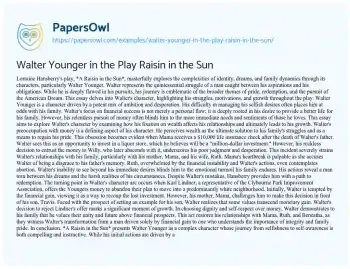 Lorraine Hansberry's play, *A Raisin in the Sun*, masterfully explores the complexities of identity, dreams, and family dynamics through its characters, particularly Walter Younger. Walter represents the quintessential struggle of a man caught between his aspirations and his obligations. While he is deeply flawed in his pursuits, his journey is emblematic of the broader themes of pride, redemption, and the pursuit of the American Dream. This essay delves into Walter's character, highlighting his struggles, motivations, and growth throughout the play.