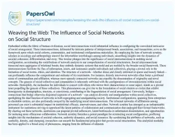 Order now Social interconnections transcend mere aggregates of relational bonds; they embody dynamic systems that mold and are molded by the broader social framework. These interconnections facilitate the flux of information, assets, and sustenance amidst individuals and collectives, playing a pivotal role in the formation of social norms, ethics, and identities. The structure of a network—whether dense and closely entwined or sparse and loosely linked—can profoundly influence the comportment and outlooks of its constituents. For instance, densely interwoven networks often foster a profound sense of communalism and affiliation, whereas more sparsely connected networks can expedite the dissemination of originality and novel concepts.