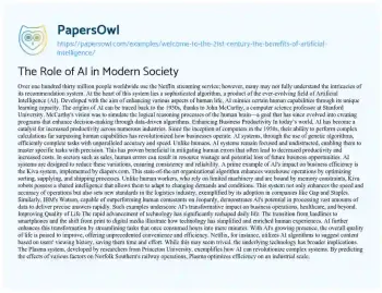 The Role of AI in Modern Society. (2019, Aug 09). Retrieved from https://hub.papersowl.com/examples/welcome-to-the-21st-century-the-benefits-of-artificial-intelligence/