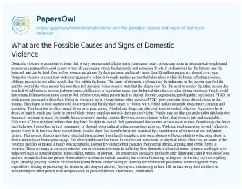 Domestic violence stems from a complex interplay of power dynamics, socio-cultural norms, personal histories, and psychological factors. Recognizable signs can include physical injuries, emotional withdrawal, behavioral changes, and fear. Awareness of these signs and underlying causes aids early intervention and support. At PapersOwl, you’ll also come across free essay samples that pertain to Abuse topic.
