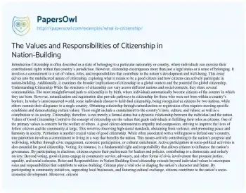 The Values and Responsibilities of Citizenship in Nation-Building. (2019, Mar 04). Retrieved from https://hub.papersowl.com/examples/what-is-citizenship/