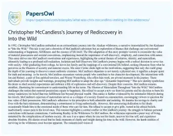 Christopher McCandless’s Journey of Rediscovery in Into the Wild. (2019, Apr 28). Retrieved from https://hub.papersowl.com/examples/what-was-chris-mccandless-seeking-in-the-wilderness/