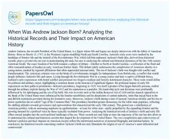 When Was Andrew Jackson Born? Analyzing the Historical Records and Their Impact on American History. (2024, May 21). Retrieved from https://hub.papersowl.com/examples/when-was-andrew-jackson-born-analyzing-the-historical-records-and-their-impact-on-american-history/