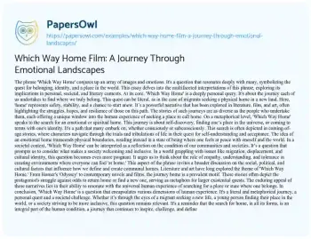 This essay explores the profound and multifaceted significance of the phrase ‘Which Way Home,’ delving into its various interpretations across personal, societal, and literary realms. It begins by addressing the literal aspect of the phrase, emphasizing its relevance to migrants seeking a physical home and the diverse narratives that emerge from such journeys. The essay then transitions to a metaphorical perspective, where ‘Which Way Home’ symbolizes an emotional or spiritual quest for identity and self-acceptance, often depicted in coming-of-age stories. Further, it examines the societal implications of the phrase, highlighting its role in prompting reflections on creating inclusive and empathetic communities. The narrative also touches upon how literature and art have historically used the journey home motif to mirror larger existential quests. Conclusively, the essay portrays ‘Which Way Home’ as a multifaceted question that resonates deeply with the human experience, encapsulating the literal and metaphorical journeys of finding a place or state of belonging. On PapersOwl, there’s also a selection of free essay templates associated with Film.
