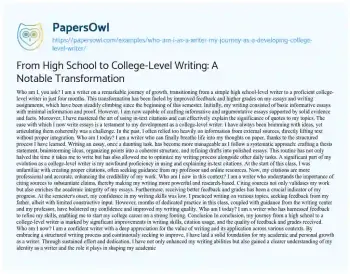 From High School to College-Level Writing: A Notable Transformation. (2023, Aug 31). Retrieved from https://hub.papersowl.com/examples/who-am-i-as-a-writer-my-journey-as-a-developing-college-level-writer/
