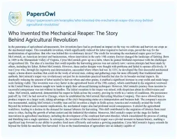 Who Invented the Mechanical Reaper: The Story Behind Agricultural Revolution. (2024, Apr 01). Retrieved from https://hub.papersowl.com/examples/who-invented-the-mechanical-reaper-the-story-behind-agricultural-revolution/