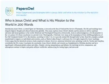 Who is Jesus Christ and What is His Mission to the World in 200 Words. (2024, Dec 27). Retrieved from https://hub.papersowl.com/examples/who-is-jesus-christ-and-what-is-his-mission-to-the-world-in-200-words/