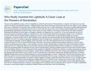 This essay about the creation of the lightbulb highlights the collective brilliance and ingenuity involved in its development. It acknowledges not just Thomas Edison, but also other key figures such as Humphry Davy, Frederick de Moleyns, John W. Starr, Joseph Swan, Lewis Latimer, Nikola Tesla, and Alexander Lodygin. Their combined efforts and innovations in electric lighting and power transmission paved the way for modern illumination, showcasing the collaborative nature of human progress.