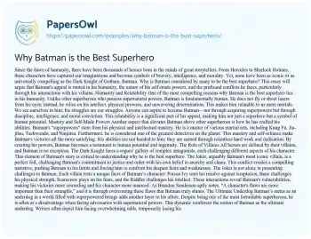 This essay will present arguments for why Batman is considered one of the best superheroes. It will discuss Batman’s human qualities, his moral code, and his reliance on intellect and physical prowess over superpowers. The piece will explore Batman’s enduring appeal and his impact on pop culture. At PapersOwl too, you can discover numerous free essay illustrations related to Batman.