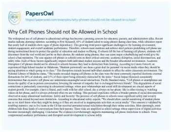 This essay will argue against the use of phones in school settings. It will discuss the potential distractions they cause, the impact on student learning and social interactions, and the challenges they pose for teachers. The piece will consider alternative policies for managing phone use in schools. PapersOwl showcases more free essays that are examples of Learning.