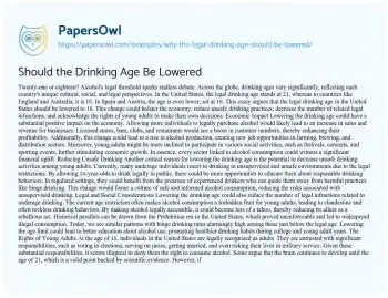 This essay will explore the debate surrounding the proposal to lower the legal drinking age to 18. It will discuss the current legal drinking age’s implications on youth behavior and social norms, comparing it with drinking age laws in other countries. The piece will analyze arguments for and against lowering the age, considering factors such as alcohol-related accidents, maturity levels, and cultural attitudes towards drinking. It will also examine the potential impact on public health, education systems, and law enforcement, drawing on research and case studies to provide a comprehensive view of this contentious issue. PapersOwl offers a variety of free essay examples on the topic of Binge Drinking.