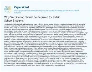 Vaccinations have been a topic of debate for many years, with some arguing that they should be a personal choice and others advocating for mandatory vaccination. When it comes to students attending public schools, there are several compelling reasons why vaccination should be required. In this essay, we will discuss the importance of vaccination in preventing the spread of infectious diseases, protecting vulnerable populations, and promoting public health.