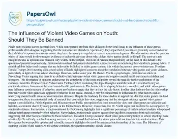 This essay will present arguments against banning violent video games from a scientific perspective. It will review research on the relationship between violent video games and aggressive behavior, discussing the complexities and nuances of these findings. The piece will argue for a balanced understanding of the impacts of gaming and the importance of parental guidance and age-appropriate content. At PapersOwl, you’ll also come across free essay samples that pertain to Adolescence.