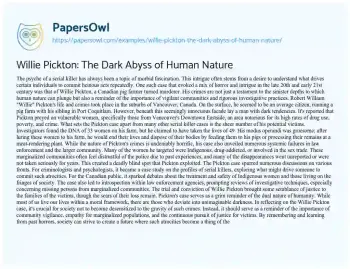 Willie Pickton: The Dark Abyss of Human Nature. (2023, Oct 10). Retrieved from https://hub.papersowl.com/examples/willie-pickton-the-dark-abyss-of-human-nature/