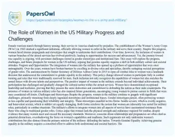 This essay will explore the progress, challenges, and future prospects for women in the US military, arguing that genuine equality requires a shift in both military culture and societal attitudes.