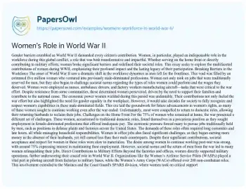 Women’s Role in World War II. (2022, Apr 29). Retrieved from https://hub.papersowl.com/examples/womens-workforce-in-world-war-ii/