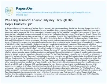 Wu-Tang Triumph: A Sonic Odyssey Through Hip-Hop's Timeless Epic. (2024, Mar 01). Retrieved from https://hub.papersowl.com/examples/wu-tang-triumph-a-sonic-odyssey-through-hip-hops-timeless-epic/
