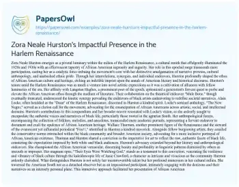 Zora Neale Hurston's Impactful Presence in the Harlem Renaissance. (2024, Mar 01). Retrieved from https://hub.papersowl.com/examples/zora-neale-hurstons-impactful-presence-in-the-harlem-renaissance/